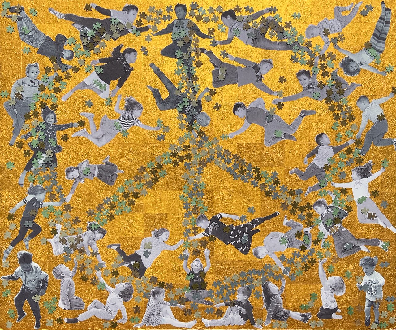 The puzzle pieces are sourced from various thrift shops and repurposed as a blank canvas for students to exercise the painting strategy unique to the Russian Hill School. The use of greens and grays reflect the colors of native trees and plants unique to the Bay Area. Each child pictured posed strategically to evoke the grand Greek Classical and Renaissance group compositions which are two prominent human civilizations that have critically shaped the idea of democracy in the United States. The puzzle pieces are carefully organized to form a symbol of peace, that is yet to be achieved in these unusual times.