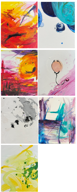 While 2026 marks the 70th anniversary of Disneyland, the students at Russian Hill School celebrate an abstract celebration: exploring the personalities of seven characters made famous from Disney’s feature-length cartoon, Snow White and the Dwarfs. The dwarfs first appeared in the Grimm fairy tale that held pride of place among the public domain before Walt and his Disney artists immortalized Doc, Bashful, Sneezy, Sleepy, Grumpy, Happy and Dopey. It is off to work we went! These seven acrylic paintings can be displayed together as a larger collection or placed individually throughout a home as talking points of modern art experience. Just as the dwarfs worked collectively in the story, the individual paintings have a connection, as notable thorn-like brush strokes appear in most of the works, suggesting the woods where the dwarfs reside.
