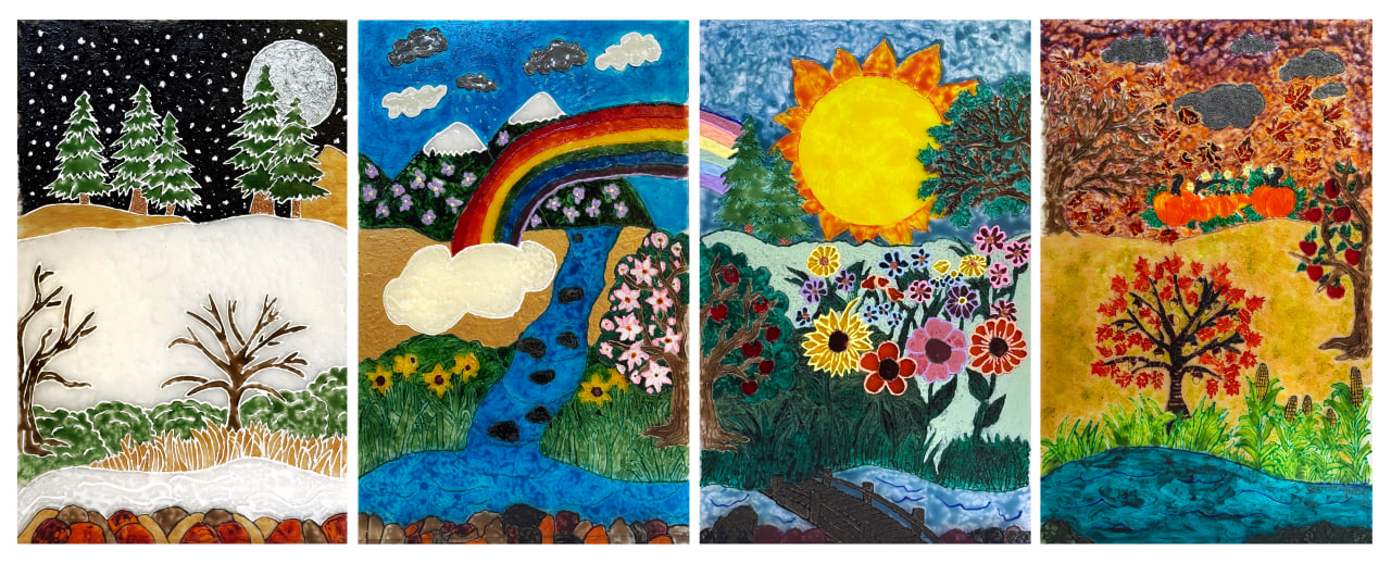This artwork is a simulated glass painting created on four acrylic panels representing the changing seasons. The project helps children learn color recognition, spacing, and how to keep colors separated within defined areas, similar to traditional glass painting techniques. As they work, children develop hand-eye coordination, careful brush control and attention to detail. By completing each seasonal panel, they also gain an understanding of how nature changes throughout the year while expressing creativity through color and design.